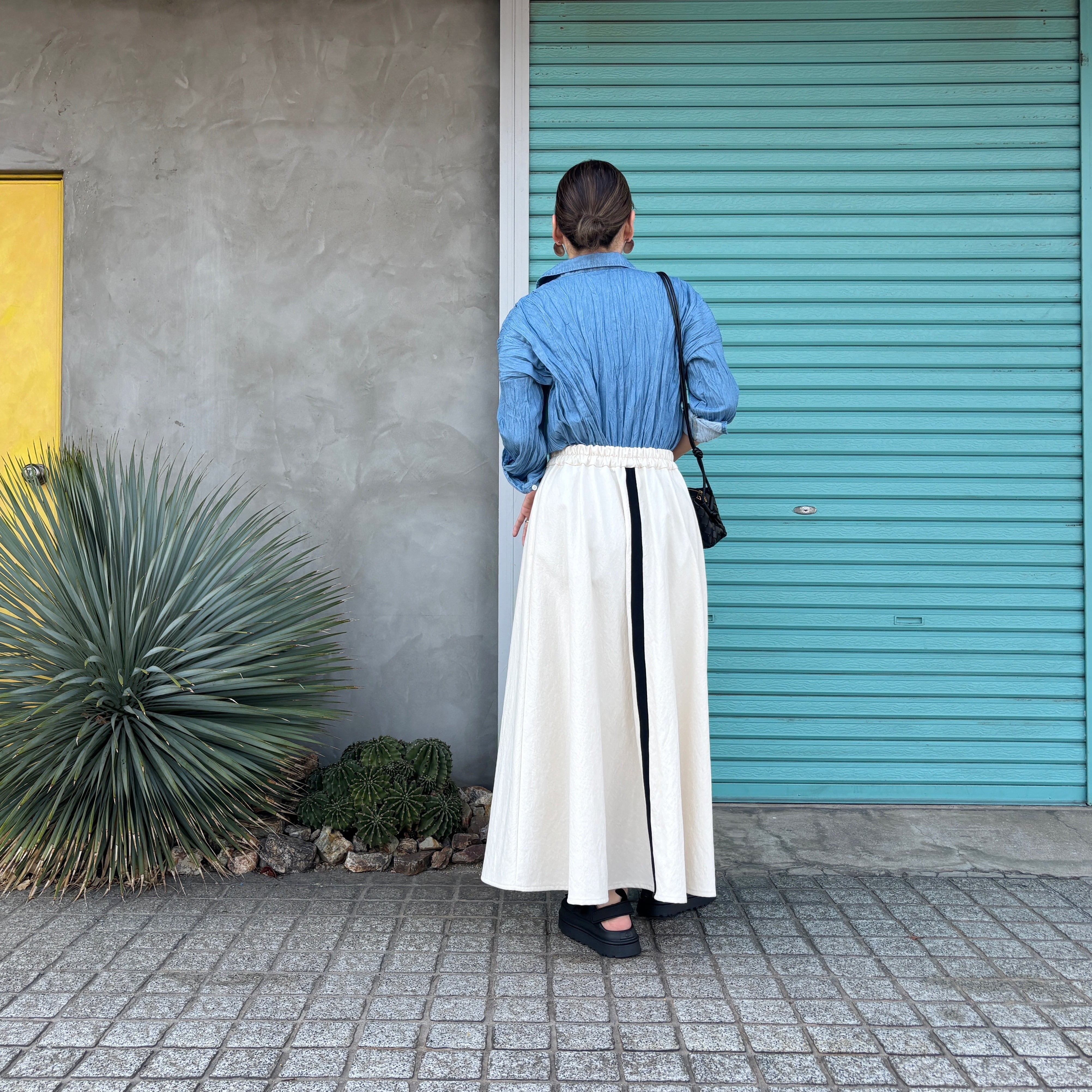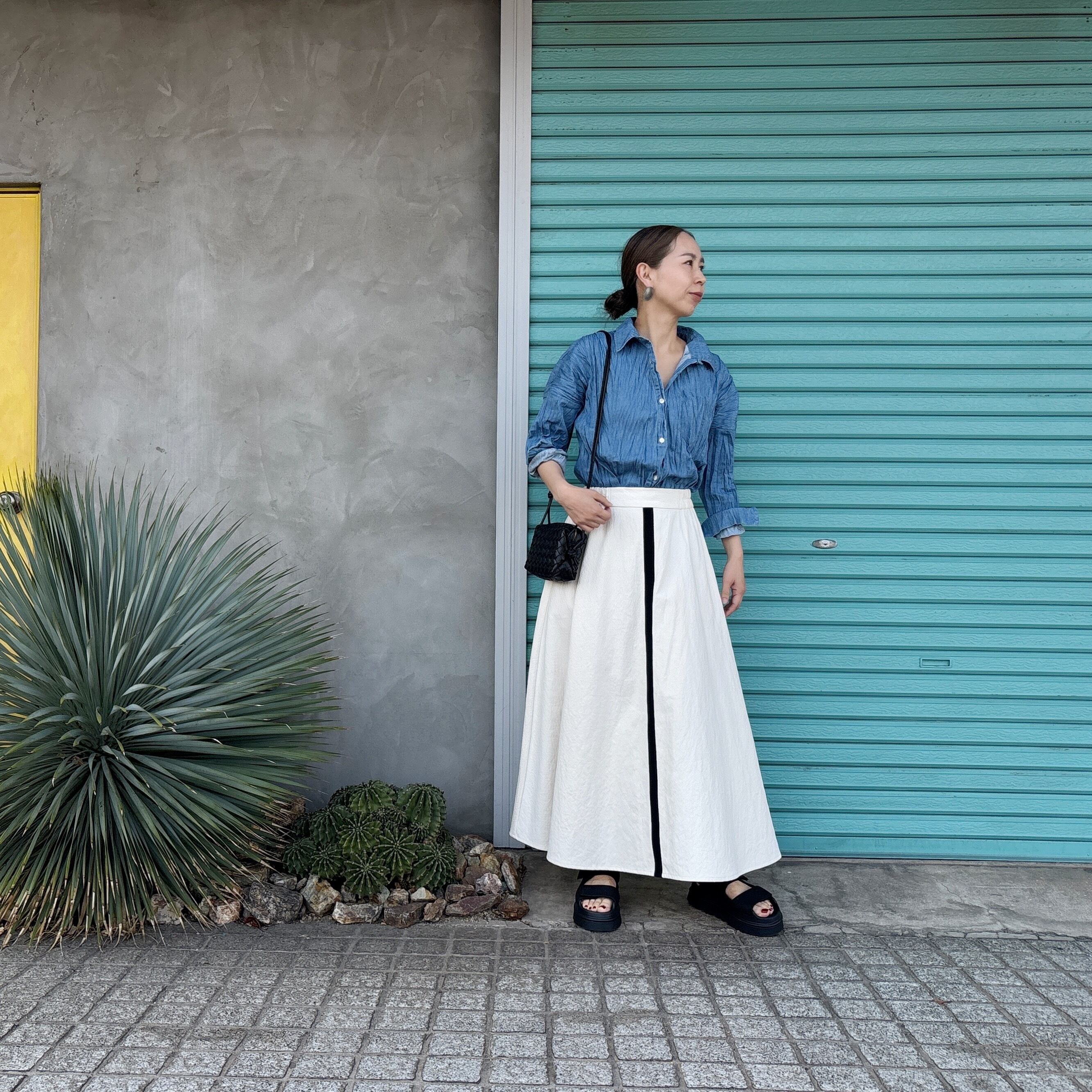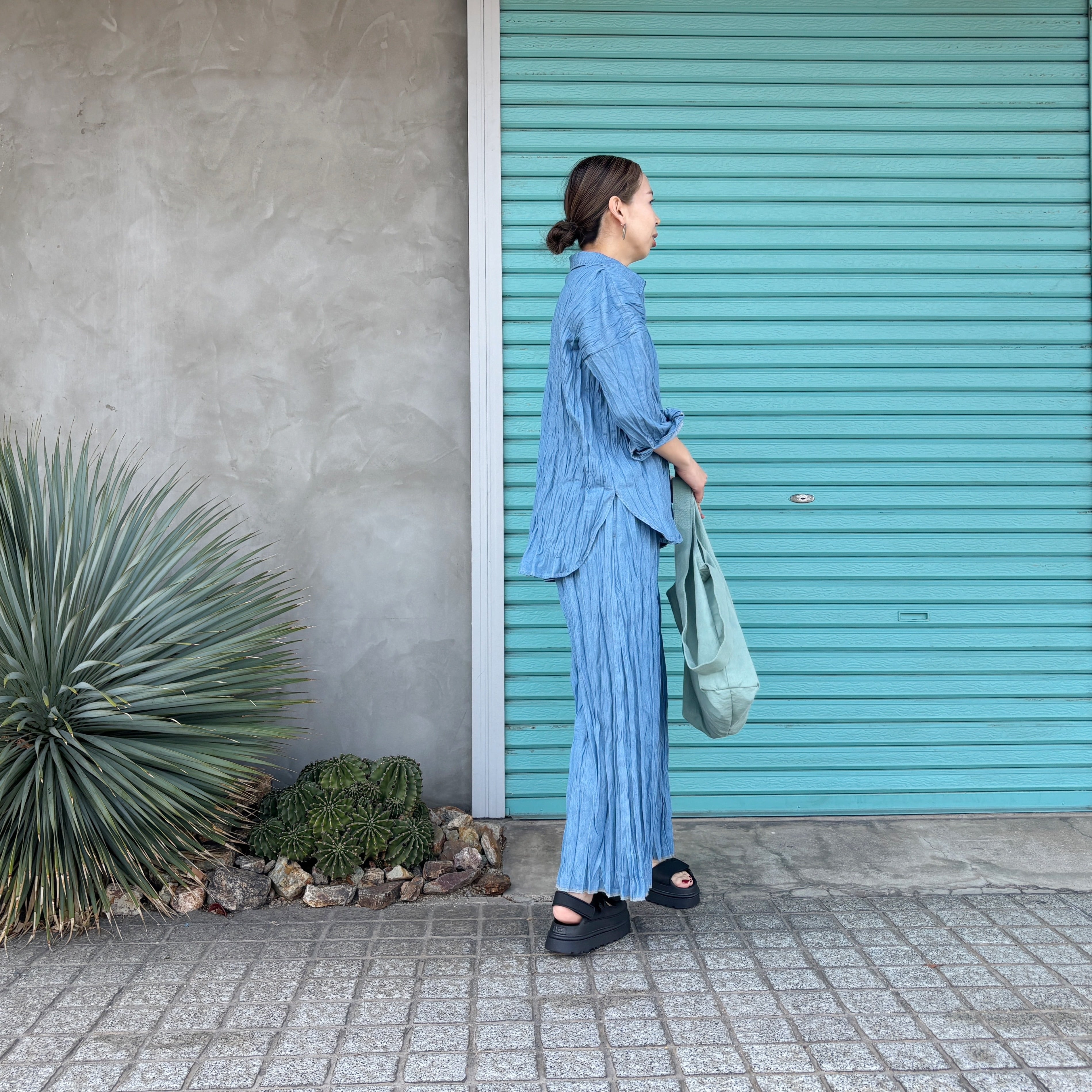 着丈も長すぎず、【ベイクド・クリンクル】のスカートやパンツとセットアップでコーディネートとしても◎